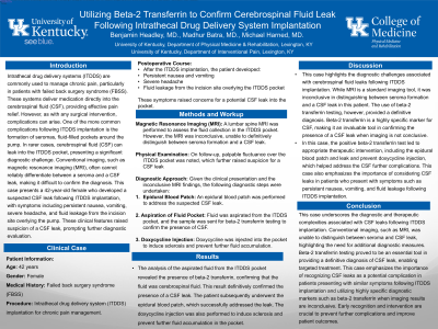 Discussion (relevance): This case underscores the diagnostic and therapeutic complexities associated with CSF leaks following intrathecal pump implantation. MRI was inconclusive in distinguishing between seroma and CSF leak, highlighting the necessity of beta-2 transferrin testing for definitive diagnosis. This case emphasizes the importance of considering CSF leaks in patients presenting with similar symptoms post-ITP implantation and utilizing the highly specific diagnostic marker, such as beta-2 transferrin, when imaging is not definitive.