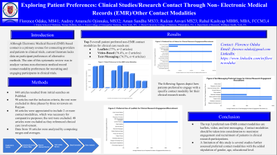 Setting : PubMed, the Cochrane library, and the National Library of Medicine were searched for articles that addressed non-EMR contact modalities (text messages, surveys, leaflets, pamphlets, email, videos, email, and/or mail) that compared participants expressed preferences for clinical research recruitment.