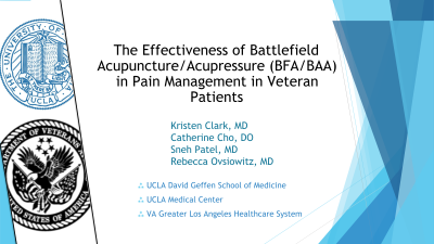 Session: Effectiveness of Battlefield Acupuncture/Acupressure (BFA/BAA) as an Adjunct Pain Intervention option in Veteran Patients - A Preliminary Study