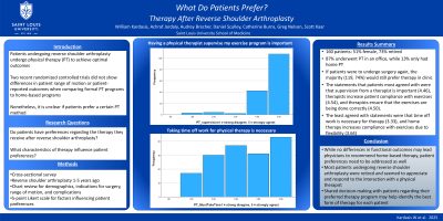 Background and/or Objectives: Patients who had a reverse shoulder arthroplasty undergo physical therapy (PT) after to achieve optimal outcomes. Two recent randomized controlled trials did not show differences in patient range of motion or patient-reported outcomes when comparing formal PT programs to home-based programs. Nonetheless, it is unclear if patients prefer a certain PT method.