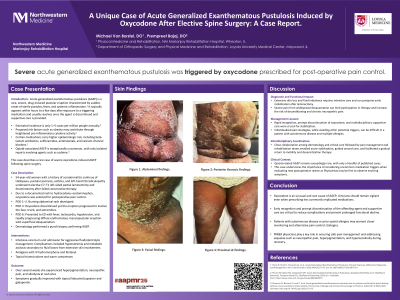 Case Description or Program Description: 54-year-old female with a history of acrodermatitis continua of Hallopeau, pustular psoriasis, drug eruptions, asthma, and left-hand pain/numbness with EMG findings of C8 radiculopathy. After failing conservative management, she underwent elective C7-T1 left-sided partial laminectomy and foraminotomy. Due to a known allergy to hydrocodone-acetaminophen (rash), she was discharged with oxycodone for severe breakthrough pain. Shortly after discharge, she developed a burning rash on her abdomen. She discontinued oxycodone on postoperative day (POD) 3, but her rash progressed, prompting ED presentation on POD6. She was febrile, hypotensive, tachycardic, and had a diffuse erythematous maculopustular rash with superficial desquamation involving her face, trunk, and extremities requiring burn unit ICU admission. Dermatology performed a punch biopsy, confirming the diagnosis of AGEP.