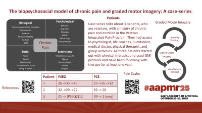 Case Description or Program Description: In these cases the biopsychosocial model of treating chronic pain using a multidisciplinary approach, including physical therapy. The patients had high pain catastrophizing scale and low pain self efficacy questionnaire scores, limiting daily functions. In these cases, pain was so bad that physical therapy was limited. The therapist started with graded motor imagery to help with decentralization of pain.