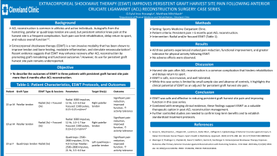 Discussion (relevance): Post-operative anterior knee/graft harvest site pain is common and can significantly impact recovery and delay return to sport. ESWT is a promising treatment option for graft harvest site pain, but there is limited research on its use for this indication. This case series demonstrated that ESWT effectively reduced pain and helped accelerate functional recovery within one year, suggesting that it is a potentially effective adjunctive treatment for graft harvest site pain.