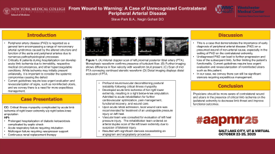 Discussion (relevance): This is a case that demonstrates the importance of early diagnosis of peripheral arterial disease (PAD) on a presumed wound of non-arterial cause, especially in the setting of PAD on the contralateral extremity. Undiagnosed PAD can lead to further progression and loss of the subsequent limb, further limiting the patient’s functionality. Current guidelines require less urgent evaluation and revascularization of noninfected ulcers such as this patient's. In our case, we convey there can still be significant stenosis requiring expeditious management.