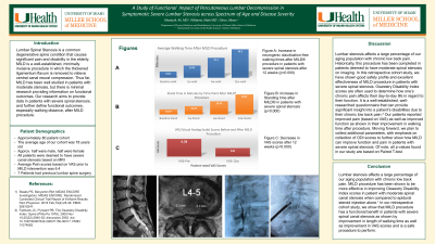 Results: Statistical analysis demonstrated significant improvement (p value) in walking tolerance, standing tolerance, neurogenic claudication pain in a cohort of patients with severe spinal stenosis treated with MILD procedure. Additional data were extrapolated such as safety and efficacy of this procedure in patients 85 years or above with comorbidities. Results were favorable in this age group