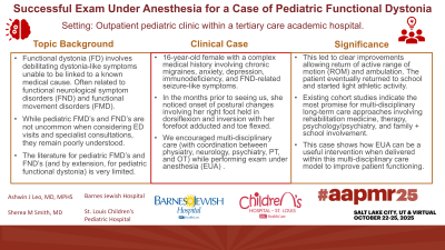 Discussion (relevance): The state of literature for pediatric FMD’s and FND’s (and by extension, for a subset like FD) is very limited. Existing cohort studies indicate the most promise for multi-disciplinary care approaches involving medical rehabilitation, PT, OT, psychology/psychiatry services, and family + school assistance, with some reports of exam under anesthesia (EUA) as a therapeutic option. Our case showed EUA playing a significant role in alleviating symptoms.