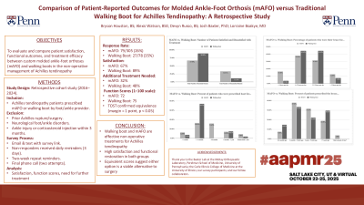 Design: Patients were identified by ICD-10 codes and prescription for a mAFO or walking boot by an orthopaedic foot and ankle provider between 2016 and 2024. After collection of patient information, surveys regarding satisfaction, functionality, and treatment course were sent to patients prescribed a mAFO or a walking boot for Achilles tendinopathy.