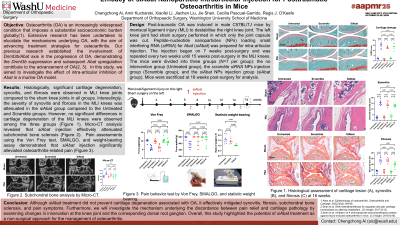Results: Histologically, significant cartilage degeneration, synovitis, and fibrosis were observed in MLI knee joints compared to the sham knee joints in all groups. Interestingly, the severity of synovitis and fibrosis in the MLI knees was attenuated in the SiAbat group compared to the Untreated and Scramble groups. However, no significant differences in cartilage degeneration of the MLI knees were observed among the three groups. Micro-CT analysis revealed that SiAbat injection effectively attenuated subchondral bone sclerosis. Pain assessments using the Von Frey test, SMALGO, and weight-bearing assay demonstrated that SiAbat injection significantly alleviated osteoarthritis-related pain.